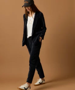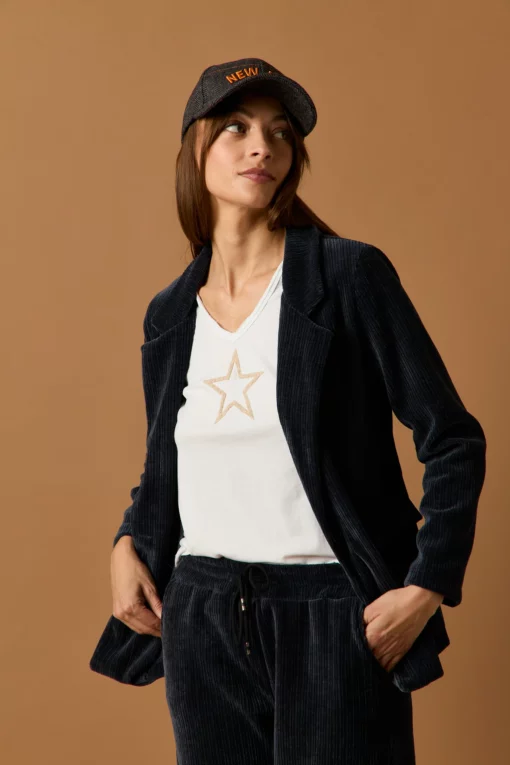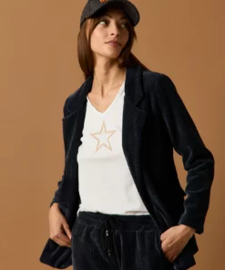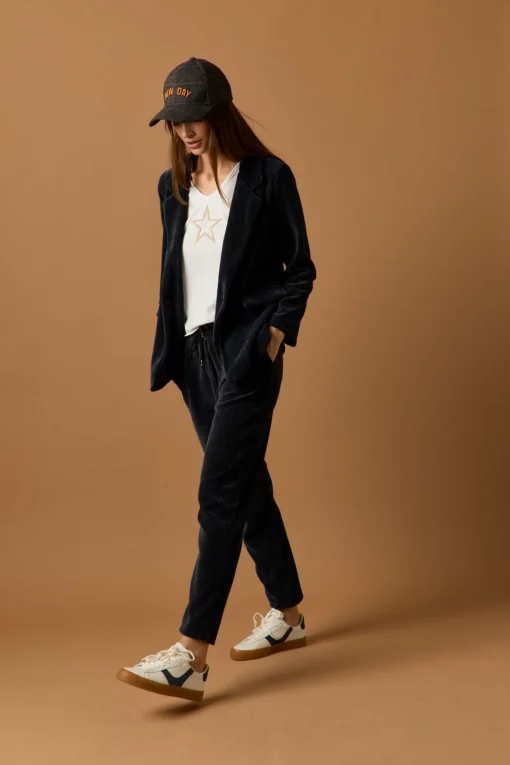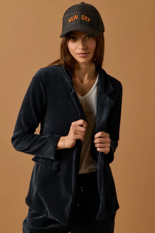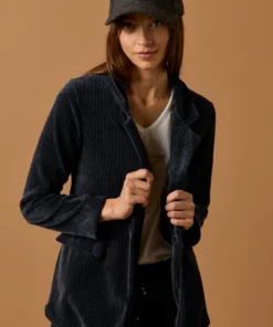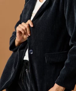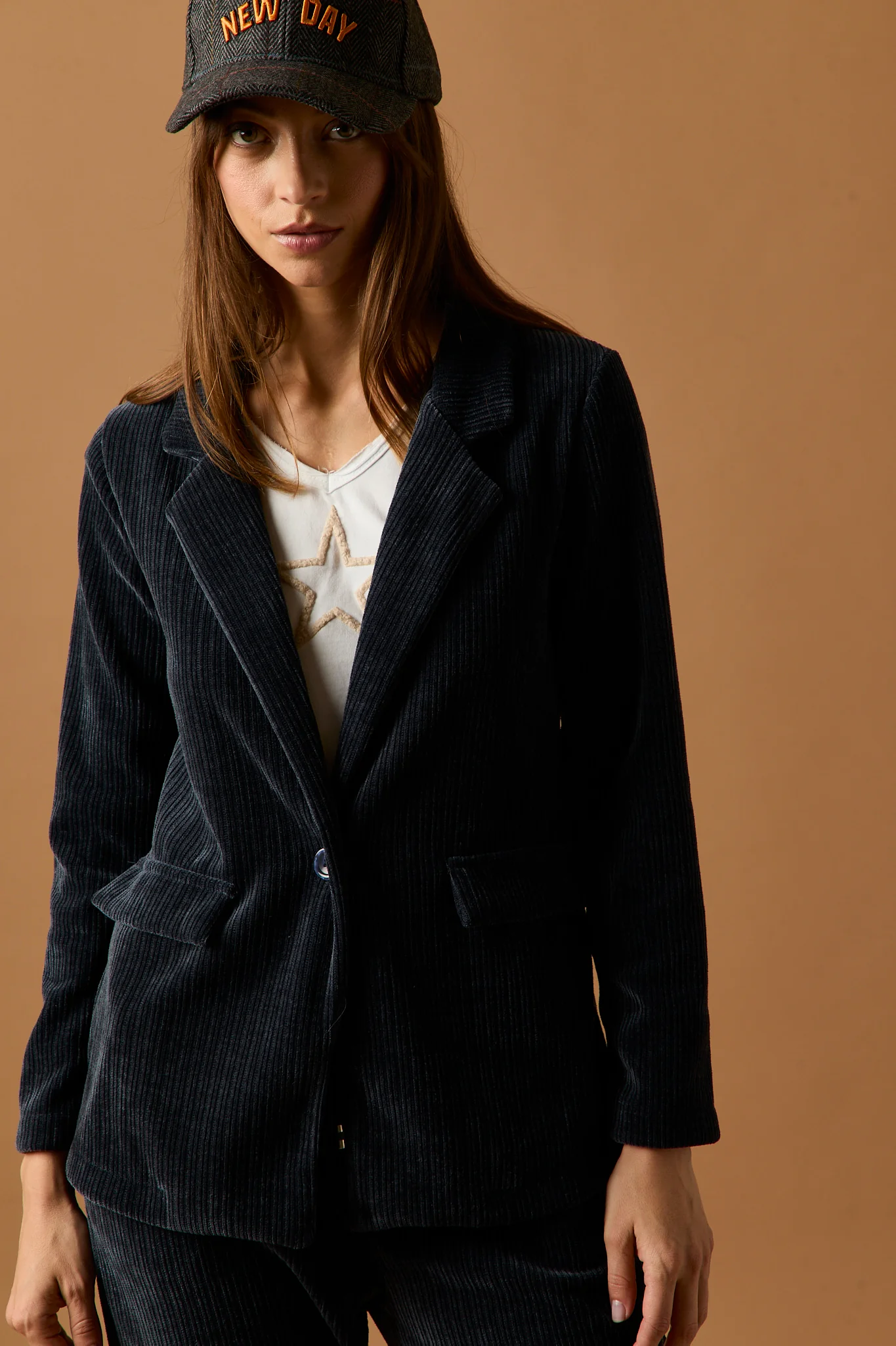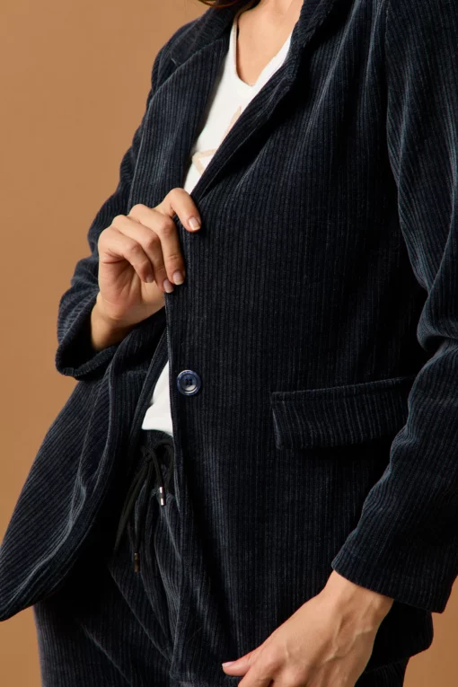Blazer de pana en color azul marino. Cuello de solapa, manga larga, falsos bolsillos laterales y cierre frontal de un botón.