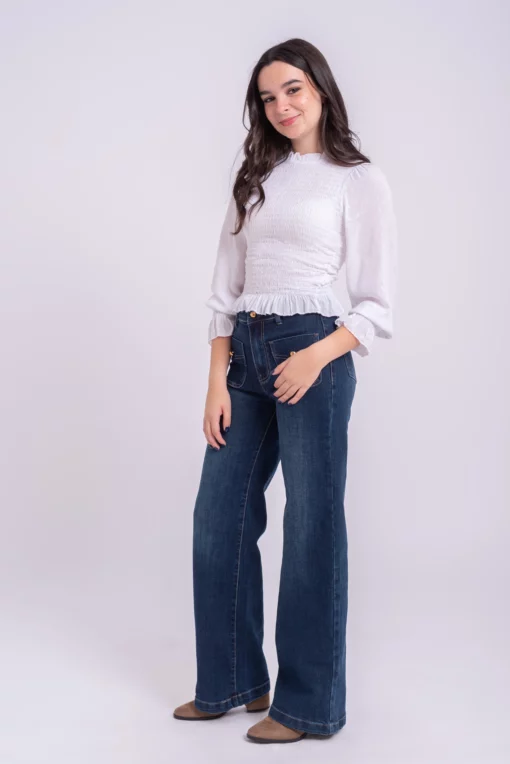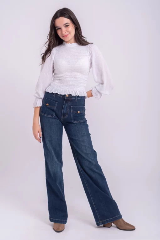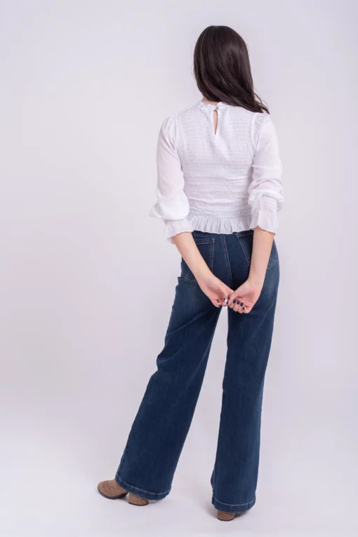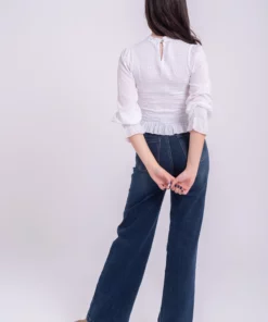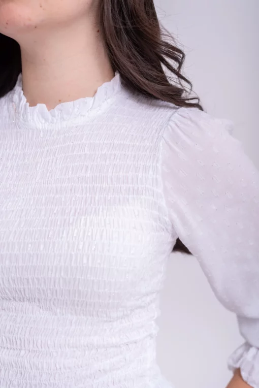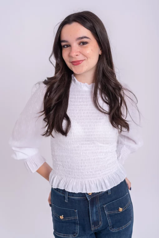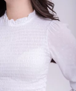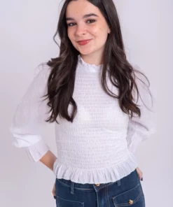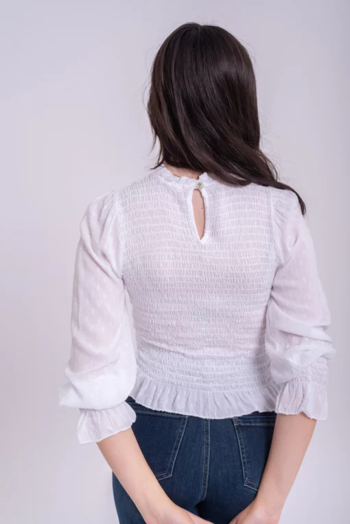 Blusa nido de abeja elastico. Manga ligeramente abullonada con goma en el puño y volante. Tejido plumeti ligero. Ideal.