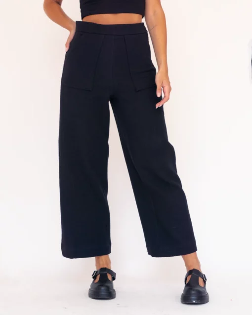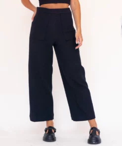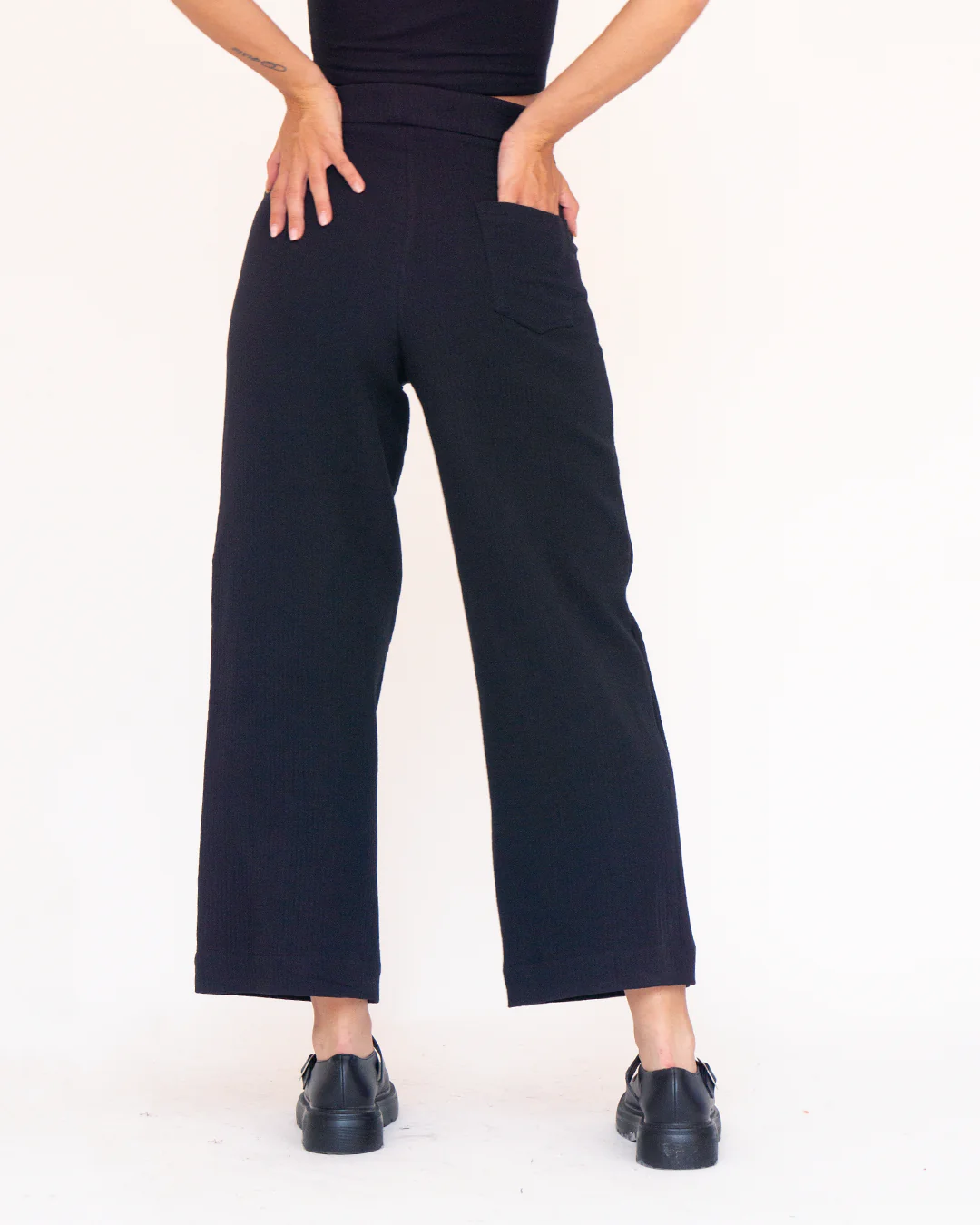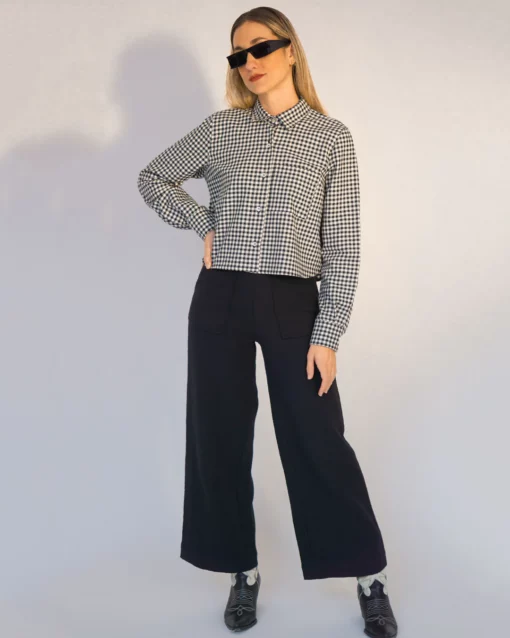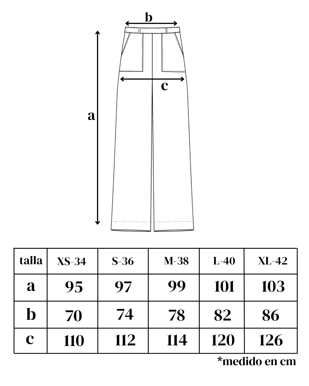 Pantalón con pernera ancha. Pespuntes y cremallera lateral.