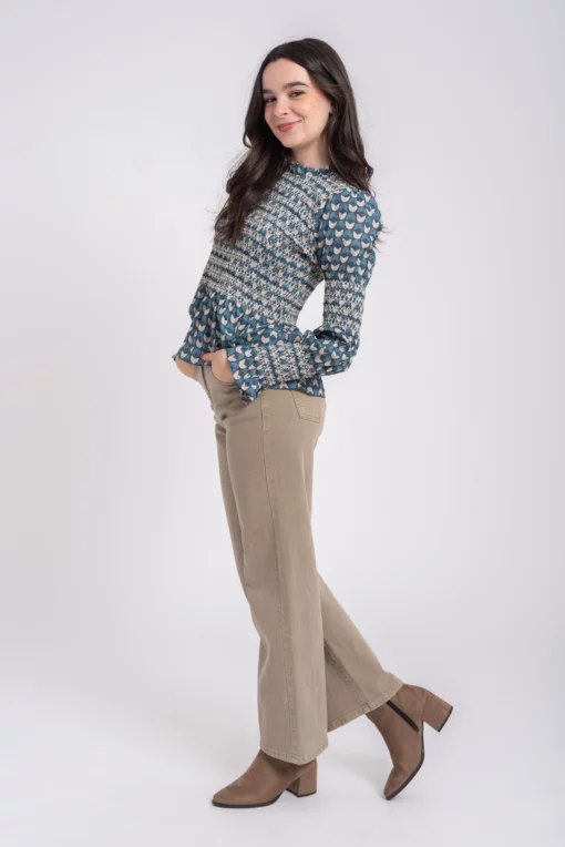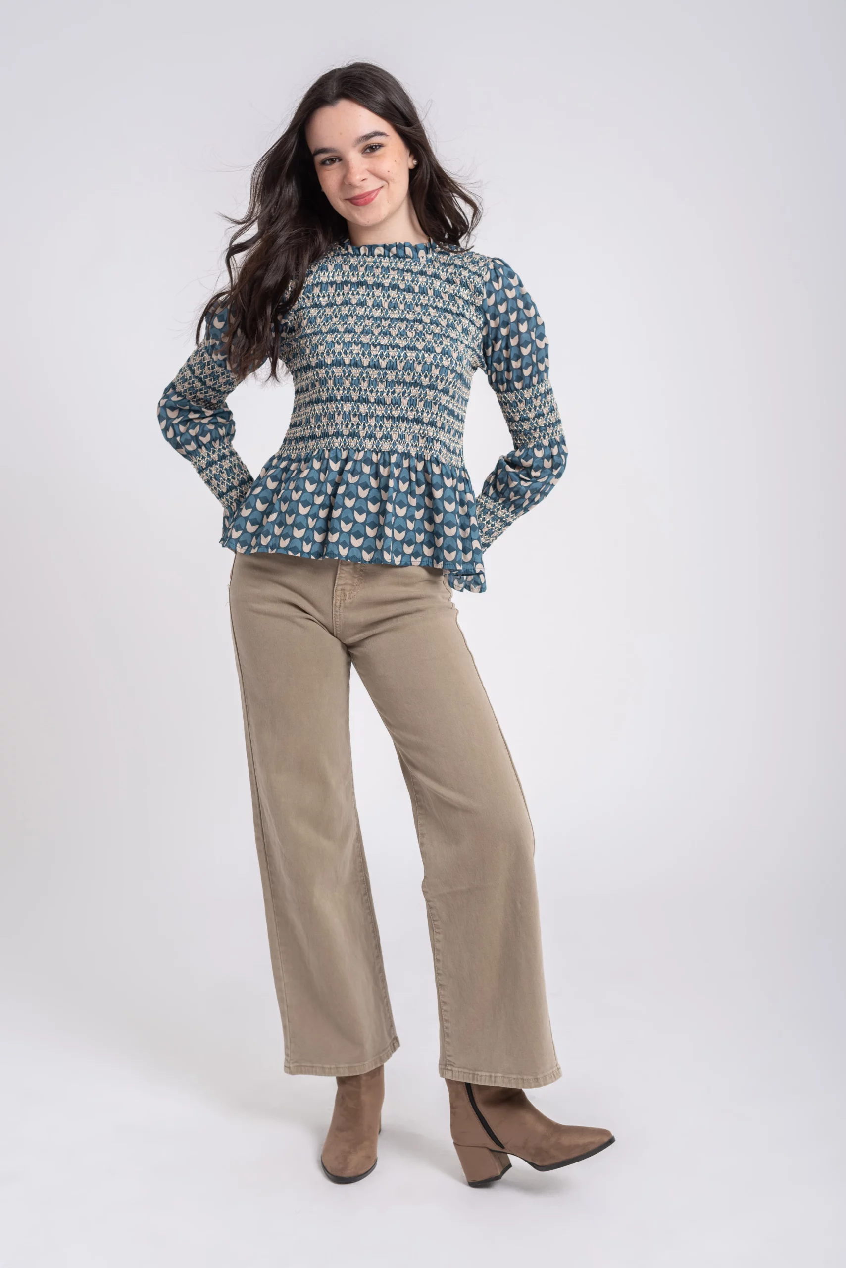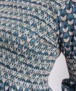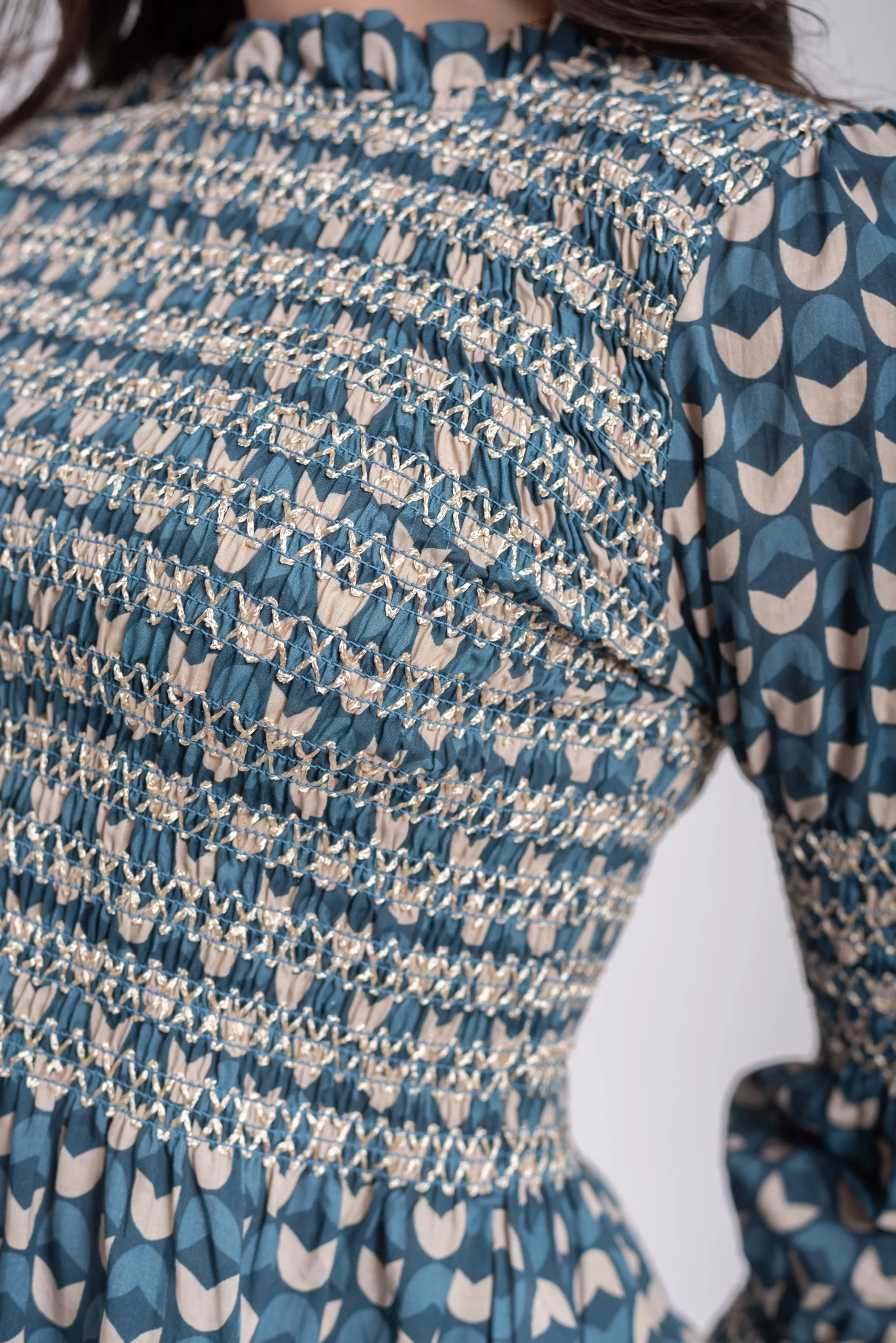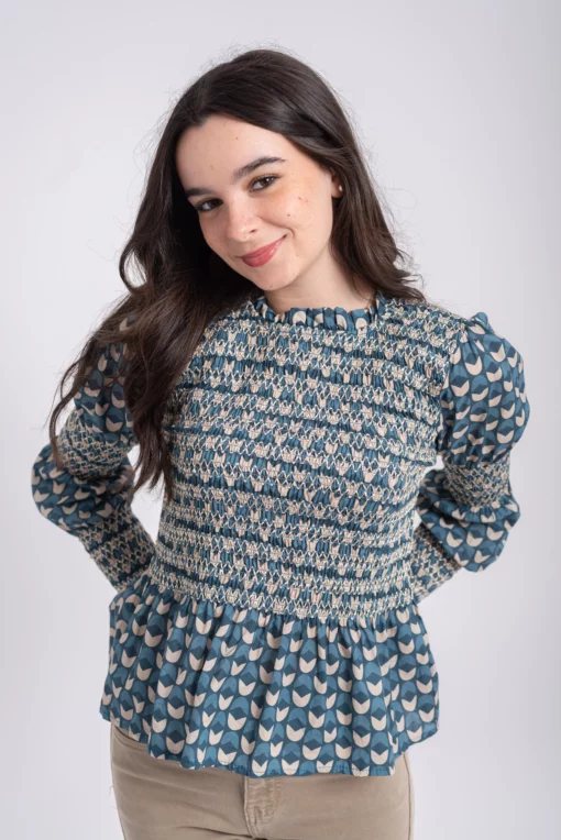 Blusa de cuello redondo y manga larga. Frunces de nido de abeja en pecho y en ambos brazos. Dibujo en hilo dorado. Fondo estampado en tonos azules.