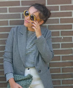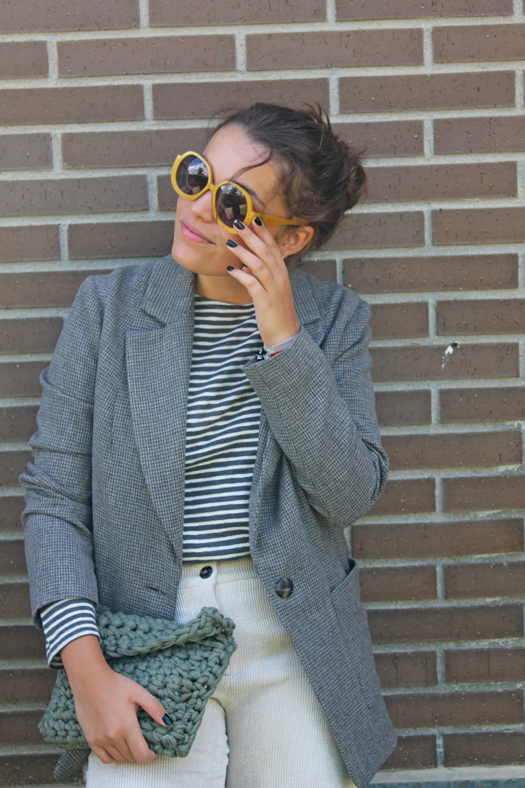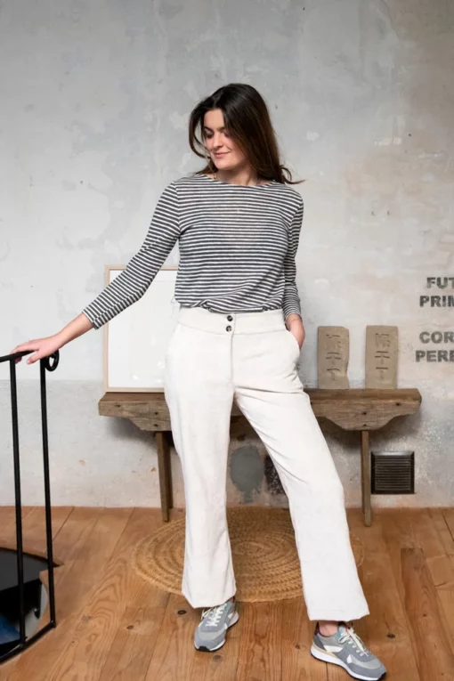 Top de rayas grises con un toque lurex plateado, realizado en un tejido mezcla de algodón suave y ligero.